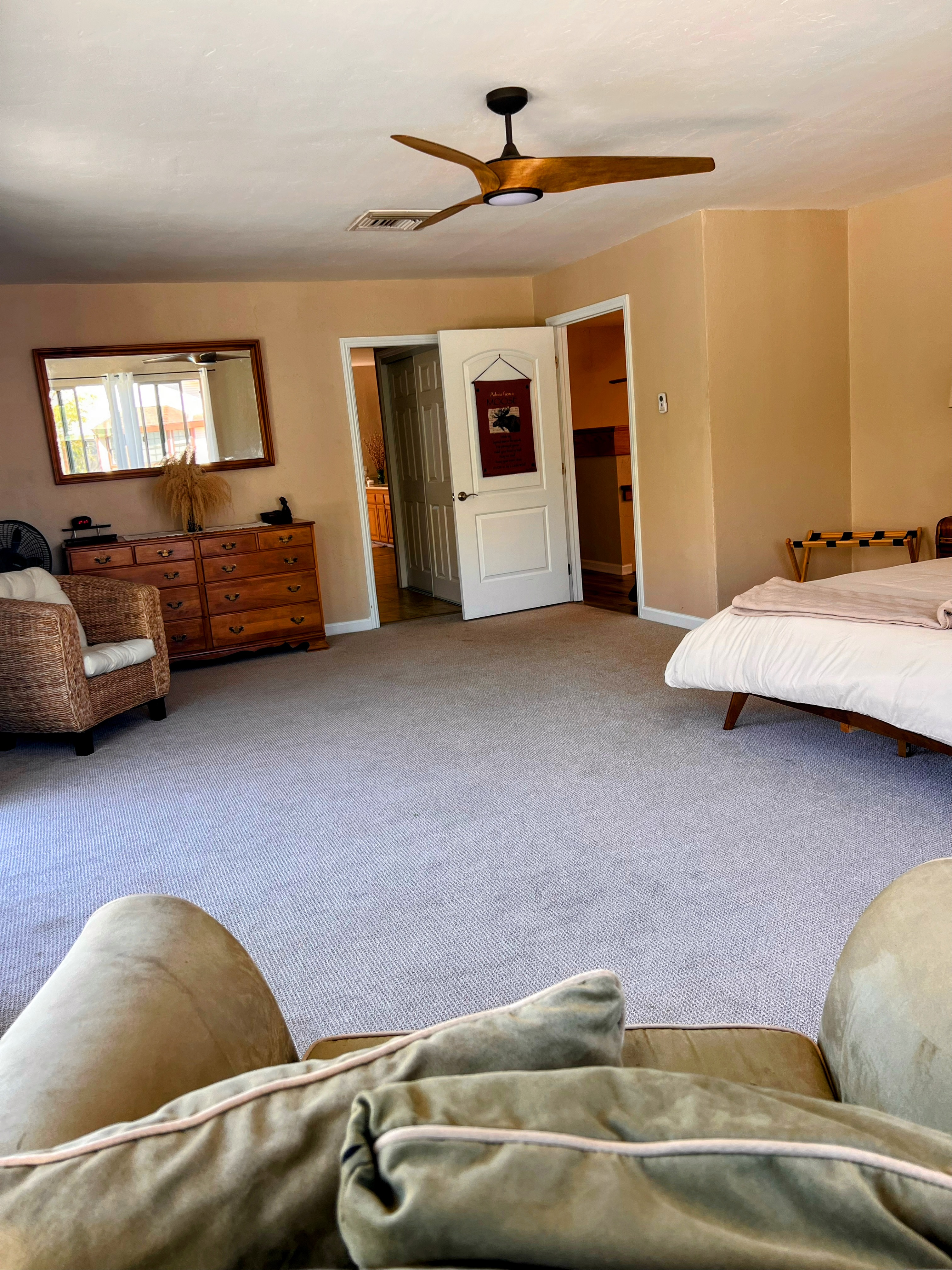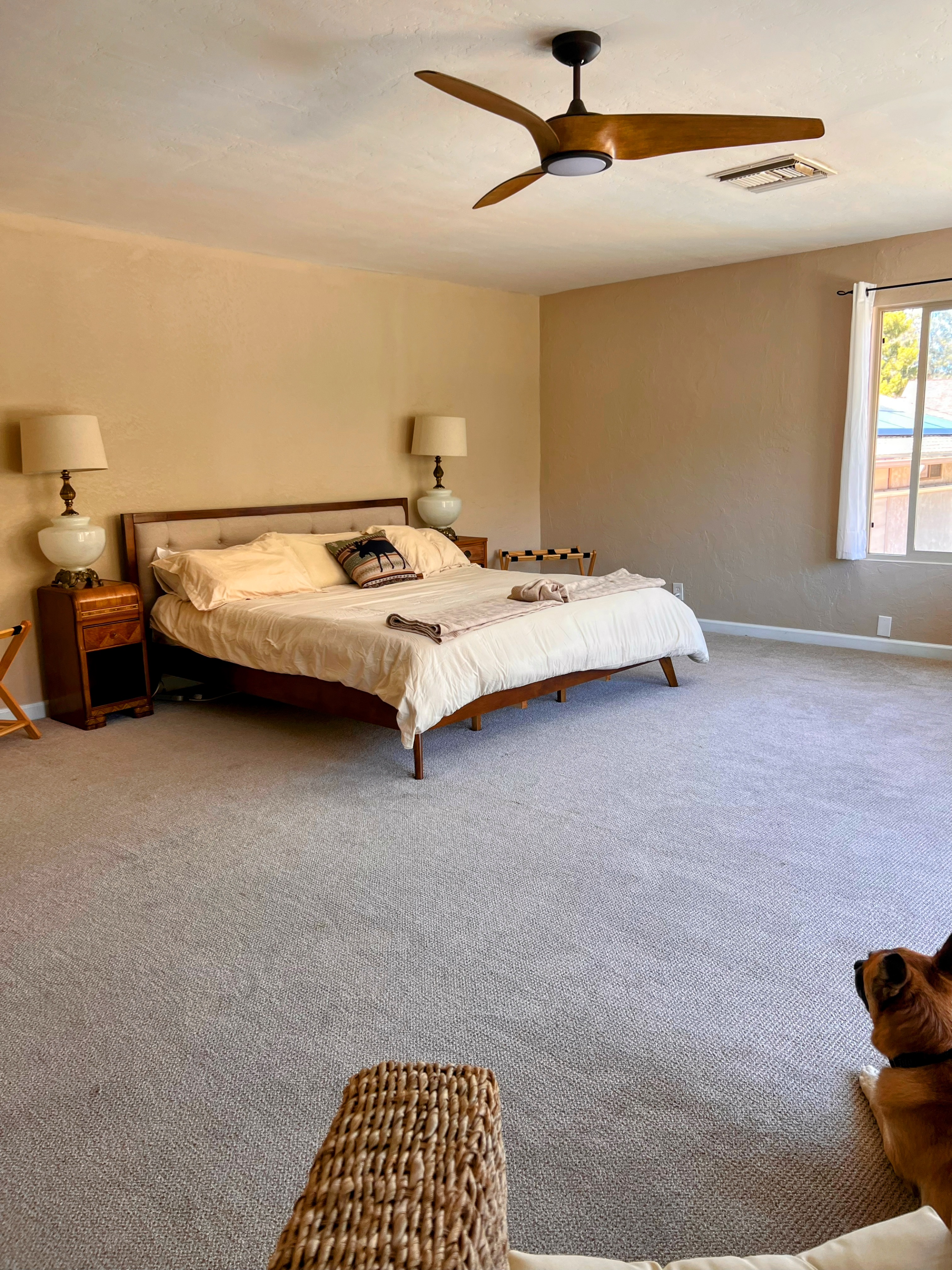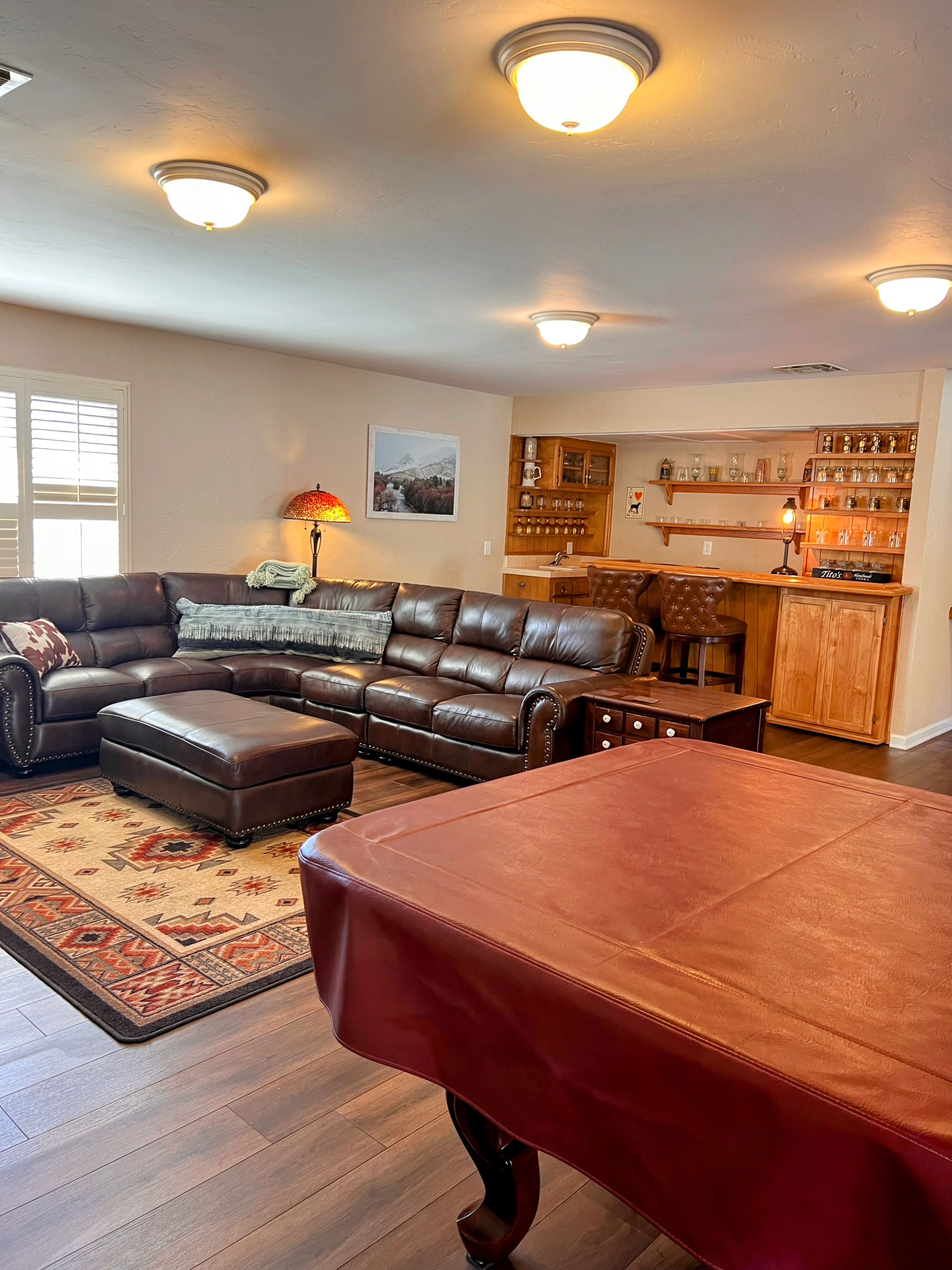 Vintage 1970's split-home design with plenty of parking, lots of space to spread out. Highlights: - 3,200 sq feet house -Wifi -Smart TV -Dog Friendly -Gameroom -Pooltable, darts, and wet bar -Washer/Dryer -Crib, high chair, baby gate -EV Charger located in garage -Gazebo - Limited workout equipment, including Peloton - Mountain views - Walking Distance to the Kern River - Near Bullrun Hiking Trail - 1 mile to downtown shops, restaurants, bars - Pool (Closed Oct 1st - May 1st) -Evaporative cooling system