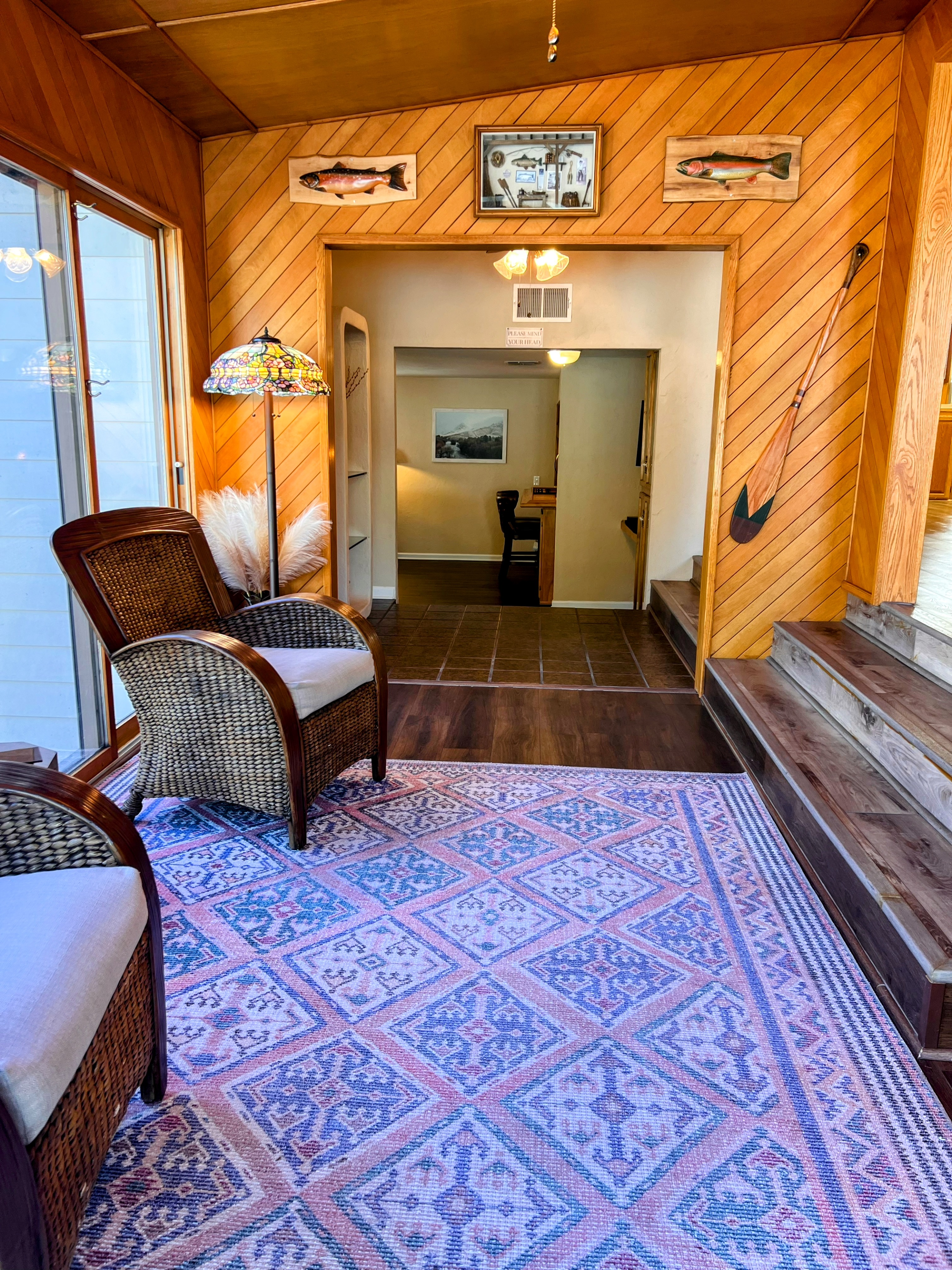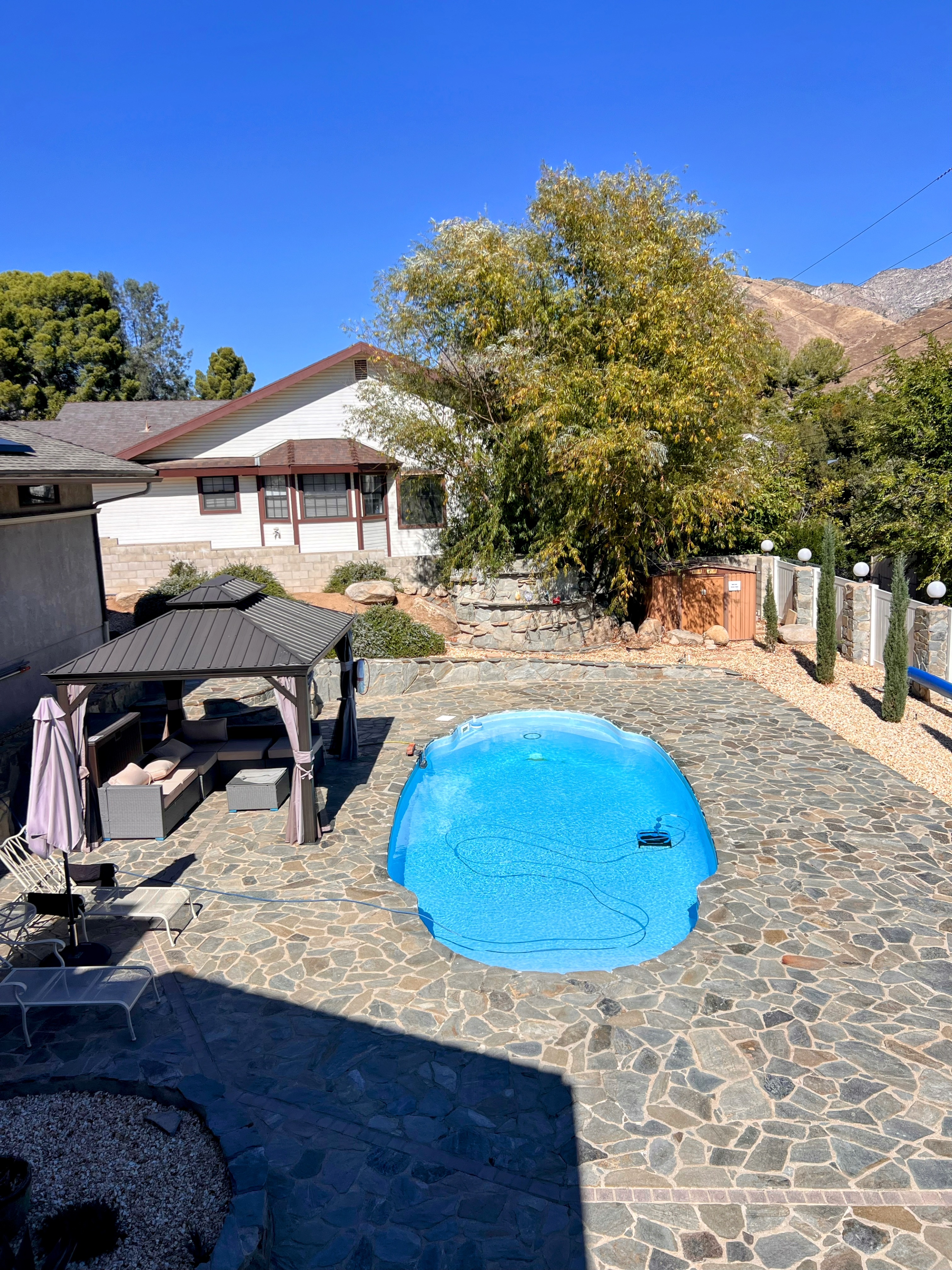 *Piedras Hermosas is a split-level vintage house from the 1970's located in a quiet corner of Kernville. It's at the southern end of the Sequoia National Forest, near the Kern River and several hiking trails. Don't be surprised if you see deer, bears, mountain cats and other wild life including a variety of birds. *When you arrive, you'll step down into a large sunken living area with lots of natural light and a fireplace. This room is where you'll enjoy meals, play cards, or just be able to sit and enjoy the space. The kitchen is fully stocked with items for preparing meals. Off the dining room, is the solarium that will take you to the pool or the game room. There, you'll find a smart tv, a pool table, darts, and a bar. Upstairs is the master suite, you'll find a king bed, side room with a nursery, and a great view overlooking the backyard, unheated pool, and the mountains. The master bath is large, with plenty of room for 2. There a two more bedrooms with queen beds that share a bathroom on the second level. The bear room has a roll up secretary where you can work. Lastly, over the game room is a loft with two twin beds.